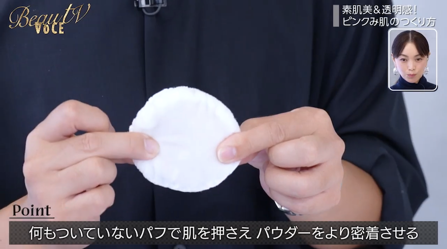 “何もついてないパフ”で肌を抑え、パウダーをより密着させます。
