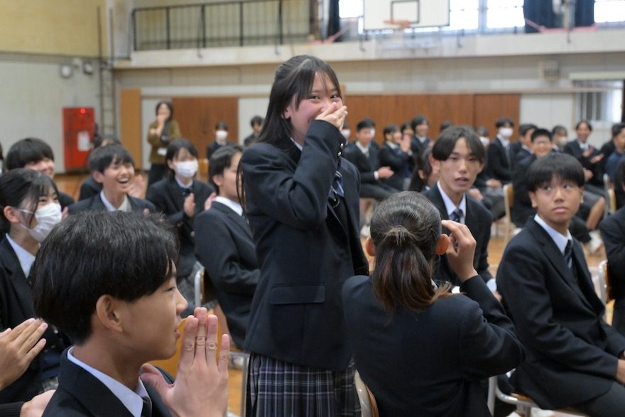 何も知らされず体育館に集合していた中学生たちは、2人の姿に大興奮。