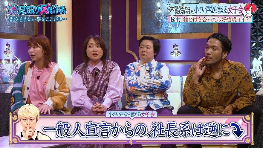 12月11日(木)の見取り図の冠バラエティ『見取り図じゃん』では、普段言えないトークを繰り広げる企画「大きい声では言えないけど、小さい声なら言える女子会」が放送された。