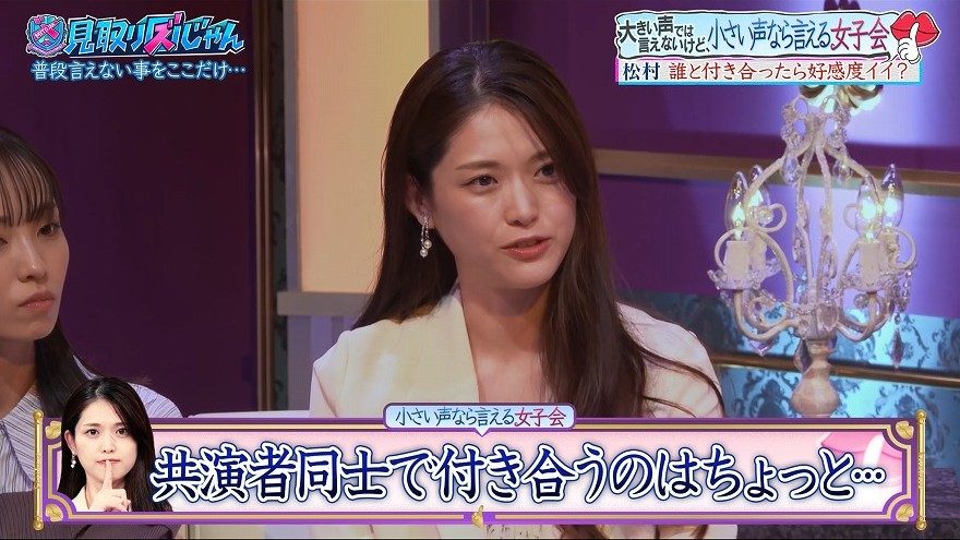 しかし松村本人は「共演して付き合うって、ちょっと嫌じゃないですか?」と共演者との交際に難色を示す。「仕事の人と付き合うんやって思われるのも嫌やっていうか…」と持論を展開すると、「いつ出会ったの?っていう」と接点がなさそうな相手がいいとの考えを明かしていた。