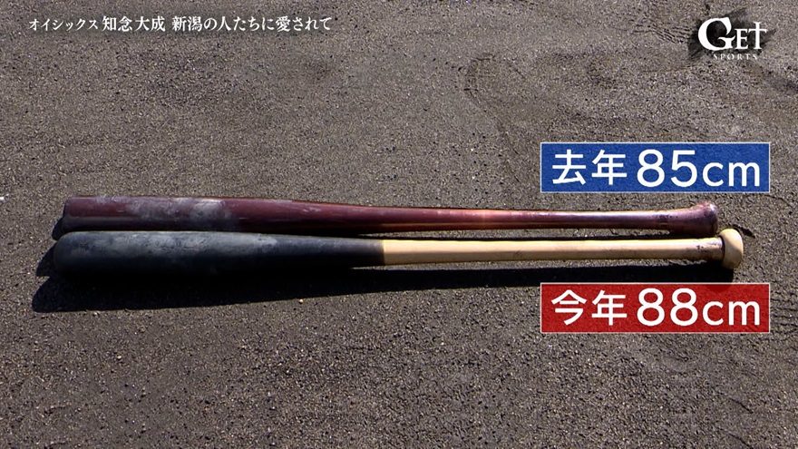 昨年まで使用していたのは、多くの選手たちが使う長さである85cmのバット。そこから3cm伸ばし、今季は88cmの長尺バットをメインで使用している。
