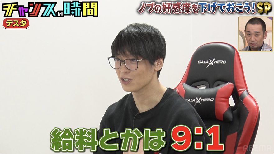 そこでノブは「吉本入りません?」「騙されてません?」と畳み掛けるように事務所トークを展開。テスタ氏は「騙すとかはないと思います」と前置きしつつ、「給料は9:1なんで」「僕が“1”ですね、“9”が事務所に入ってる」と告白する。