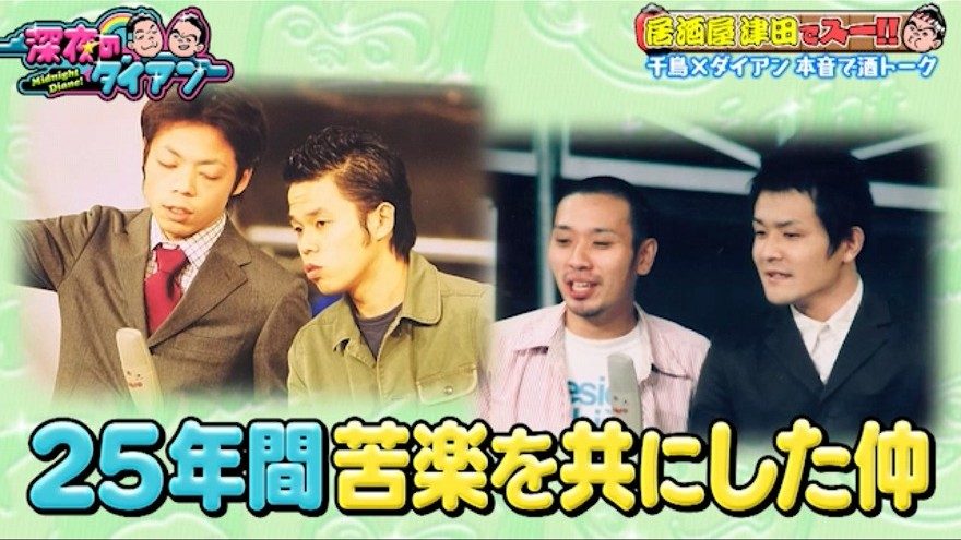 ダイアンと千鳥は25年間苦楽を共にしてきた盟友だが、意外にもテレビで 4 人だけで酒を飲んで深い話をするのは初めてとのこと。