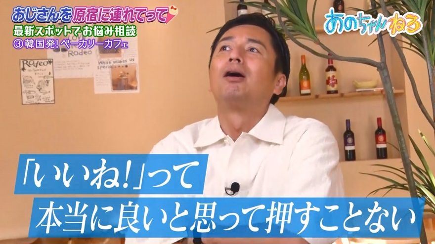 「部下のインスタに“いいね!”を押したら、『見てるんですね…』って言われて。交流を深めるためにSNSを見たのに、見ちゃダメなんですか?」という悩みが紹介されると、あのちゃんは「いいね!は別に交流を深めるきっかけにならないかも」と断言した。