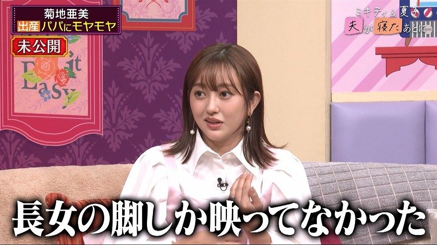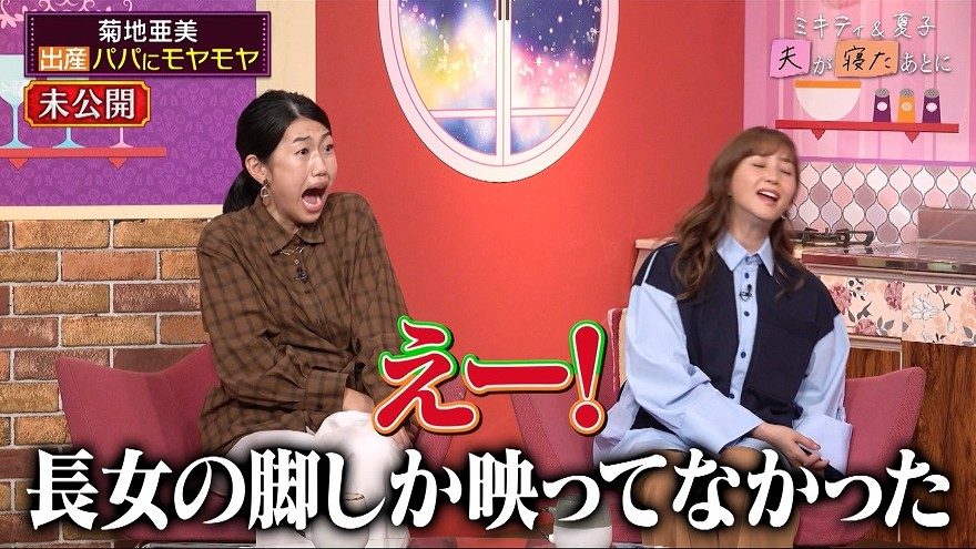 出産の瞬間、一緒に立ち会っていた長女を抱きながら夫も「頑張れー!」と設置したカメラの存在を忘れてしまったらしい。菊地は「(出産中は)こんなのわからないじゃん!」と不満を漏らしていた。