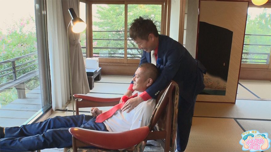 ところが風呂では、浮かぶ椅子の上で“落とし合い”をはじめるまさかの展開に。さらに益子が「やめろよぉ」と叫ぶのを皮切りに、互いに体を叩き合う。