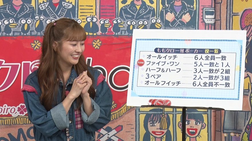 番組MCの東京03・飯塚悟志が収録をお休みしたため、ももクロのメンバーやゲスト芸人が交代でMCを務めている。今回は佐々木彩夏が担当中。遊んでいるのは人気コーナー「ももクロ一致ポーカー」だ。