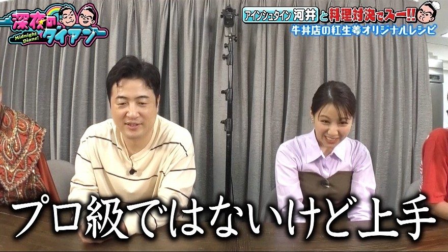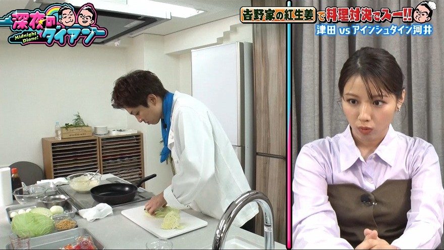 その後河井はタルタルソース作りへ。玉ねぎをみじん切りにする手つきにダイアン・ユースケが「包丁さばき見てたらほんまにやってるのがわかる」と感心すると、水田がここでも「プロ級ではないですけど上手ですよね」と一言多い褒め方。これには渡邉もうつむいて笑っていた。