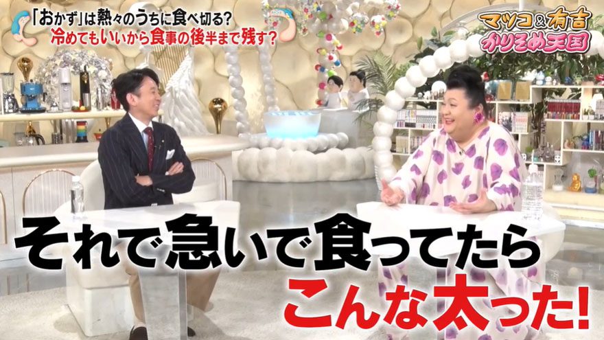 そんなマツコは、「火傷してもいいから熱いものを熱いうちに食べたい」という思いから、餃子をフライパンから直接食べることもあるという。「ごはんもあったかいし、おかずもあったかいし、お味噌汁もあったかいしってなって急いで食べてたらこんなに太った」と自虐し、スタジオを沸かせた。