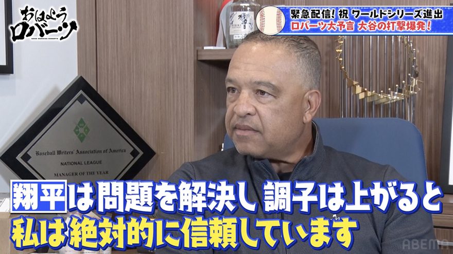 10月21日(火)放送の同企画では、ナ・リーグ優勝決定シリーズ第3戦の試合直前(10月17日)のロバーツ監督を直撃。大谷翔平選手の打撃復調の裏側を語る場面があった。