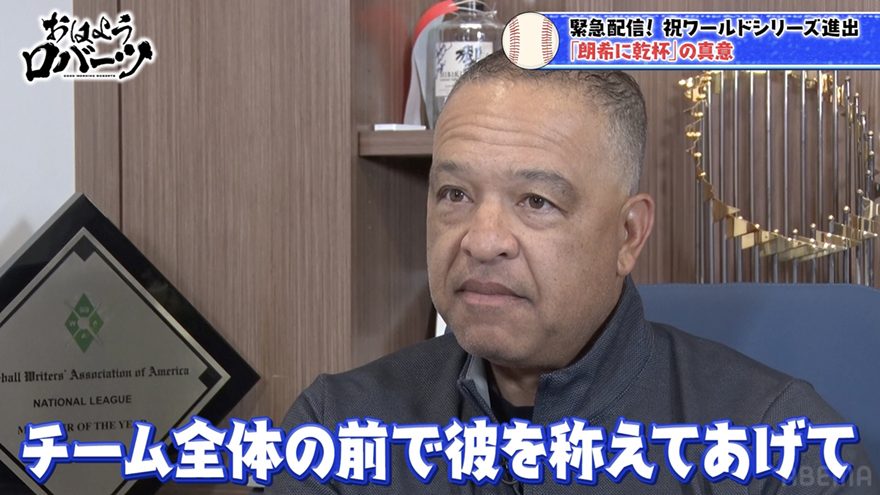 また、ディビジョンシリーズ制覇後のシャンパンファイトで「朗希に乾杯」と発言していたロバーツ監督。その理由について、「朗希は非常に重要な役割を果たしました」「チーム全体の前で彼を称えてあげて彼に乾杯してあげたかった」「彼の自信はさらに高まったはず」と語った。
