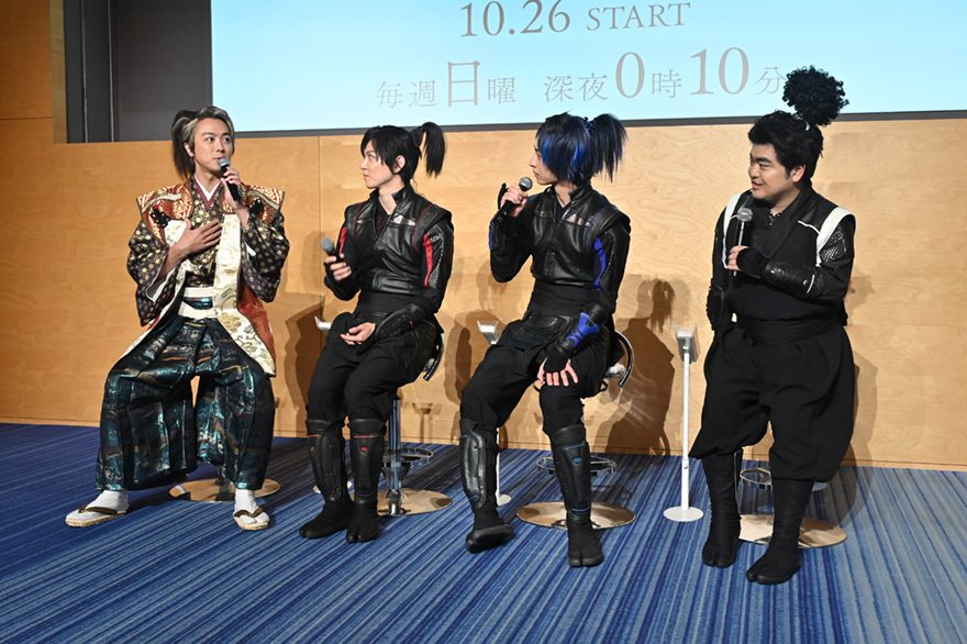 「いよいよ始まる『仮面の忍者 赤影』の魅力をタップリと伝えられたらと思います!」と座長・佐藤があいさつをすると、「演じる青影の魅力を伝えていきたい!」(木村)、「長い間撮影をしていますが、僕も放送を楽しみにしています!」(加藤)とそれぞれアピール。