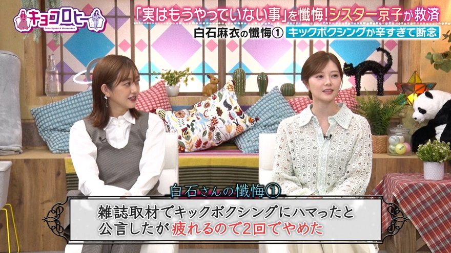 白石は、過去に「キックボクシングにハマっている」と公言したことがあったそう。「すごい楽しくて筋肉痛も最高ですって言っていたのですが…とにかく疲れる(笑)。なかなか続かず、2、3回行ってもうキッパリやめてしまった」と正直に告白した。
