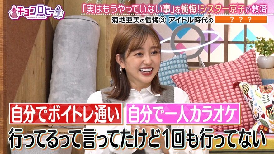 アイドリング!!!時代を振り返った菊地は、「歌が結構苦手だったんですよ。でもセンターにいきたいしいっぱい映りたいから、『自分でボイトレ通って一人カラオケに行ってる』って言ってたけど…1回も行ってない」とまさかの事実を打ち明けた。