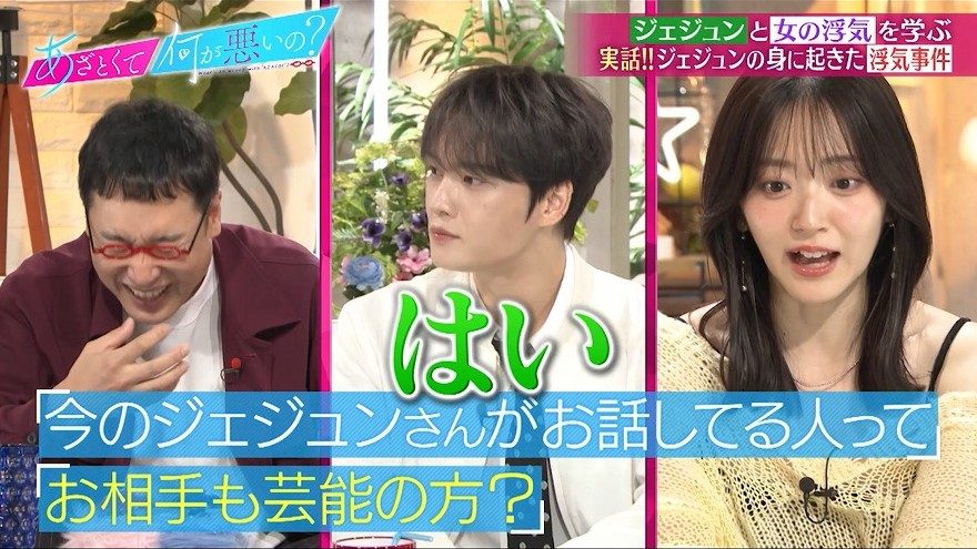 今回のテーマは「女性の浮気」。20~40代の男女の約3人に1人が浮気しているという調査結果が紹介されると、MCの山里が「こんな質問していいのか、ジェジュンさん…」と聞きにくそうにしつつ「ズバリ、浮気のご経験は?」と切り込んだ。
