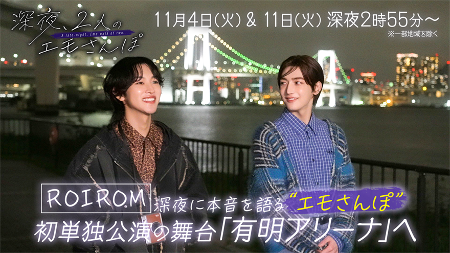 1&2週目は、タイプロファイナリスト・ROIROM(本多大夢、浜川路己)の2人。自身初の単独公演を控える有明アリーナを目指し、深夜の有明の街を歩きながら本音を語り合う。