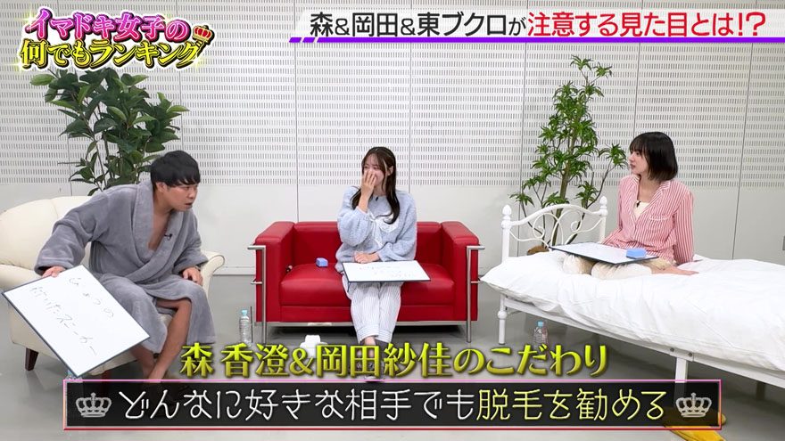 東ブクロが「夜、初めてそういうことになるってなったとき、ボーボーに生えているやつが来たら?」と尋ねると、岡田は「やだぁ。脱毛させるかもしれない」と眉をひそめる。森も「遠回しには(脱毛を)勧めるかも」と賛同し、どんなに好きな相手でも“毛がボーボー”なのは許せないようだ。