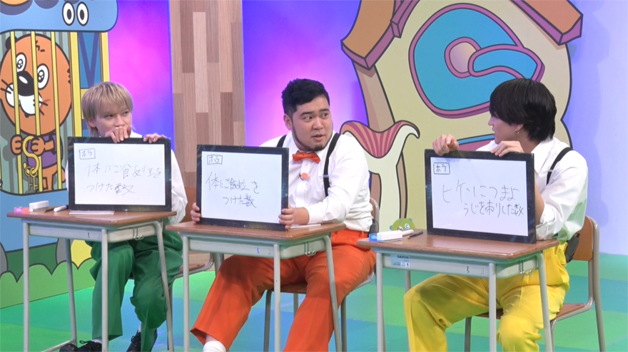 二階堂高嗣(Kis-My-Ft2)、松井ケムリ(令和ロマン)、猪俣周杜(timelesz)の3人が、ちょっと奇妙な教育番組の世界で教育ゲームに挑戦する『ニカゲーム』。