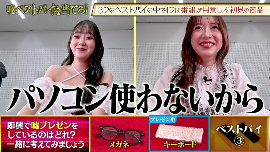 今回は堀をゲストに迎え、2人が今年買って良かった商品を互いにプレゼンすることに。しかし、その中に今日初めて見た“嘘商品”が一つだけ混じっている。うまく嘘をつけるかを競う、騙し合いバトルが繰り広げられた。