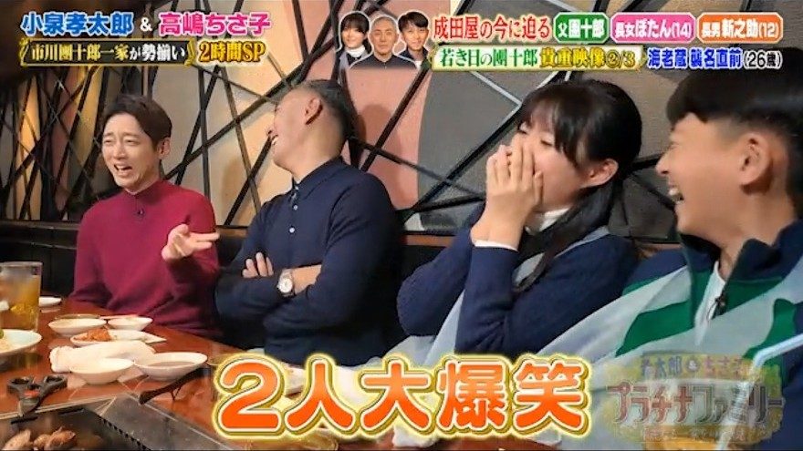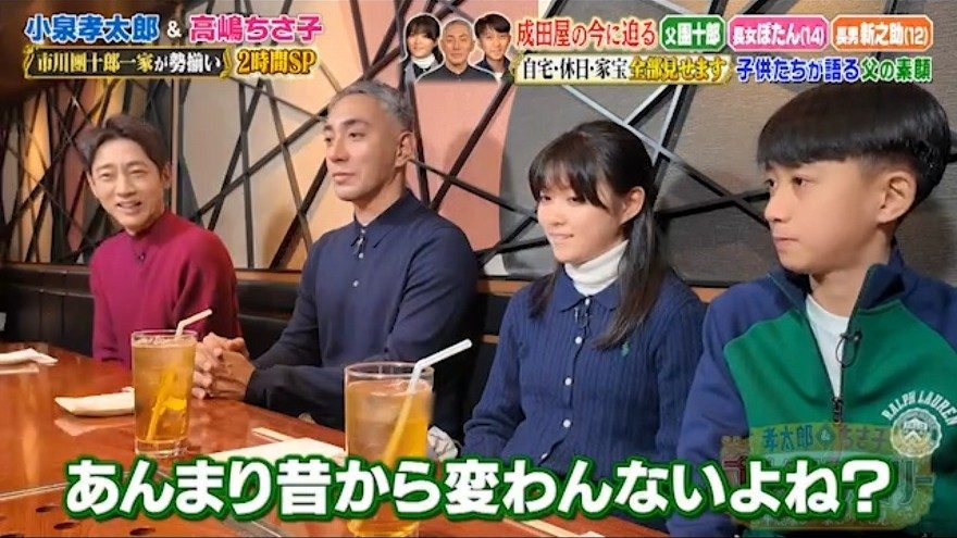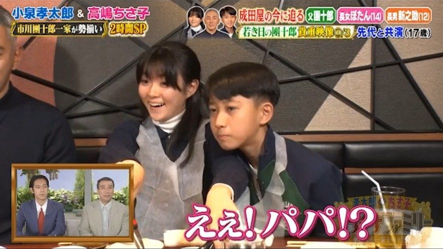 團十郎の若かりし頃の映像が紹介されると、父の初々しい姿に2人の子どもは笑いを堪えられず…。