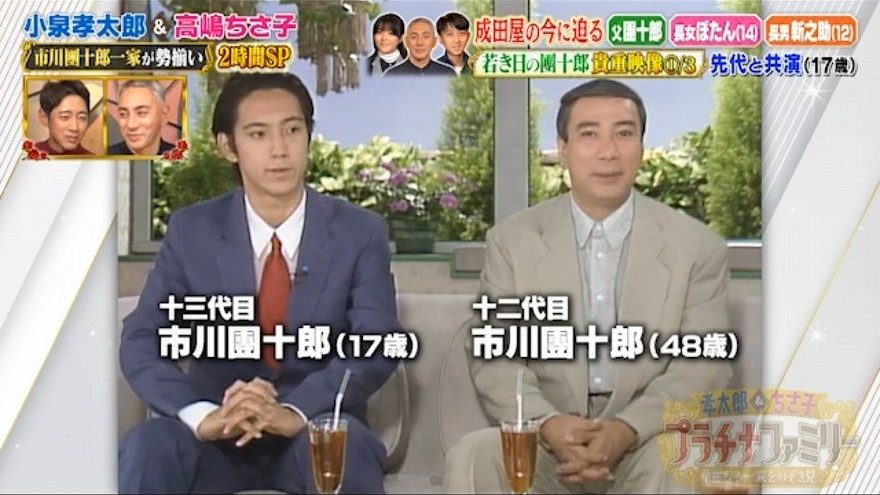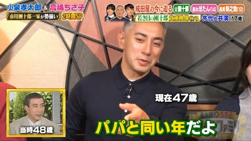 團十郎は現在の自分と同じ年齢の先代の姿が面白いようで、「パパと同い年だよ。ちょっと老けてない?貫禄ありすぎない?」と笑っていた。