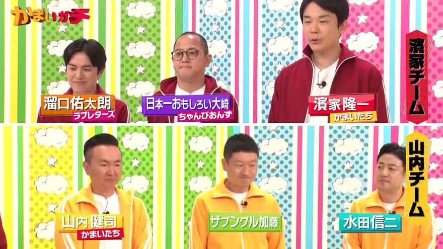 今回は濱家チームにちゃんぴおんず大崎、ラブレターズ溜口が参戦。山内チームには水田信二、ザブングル加藤が加わり、白熱バトルを繰り広げた。