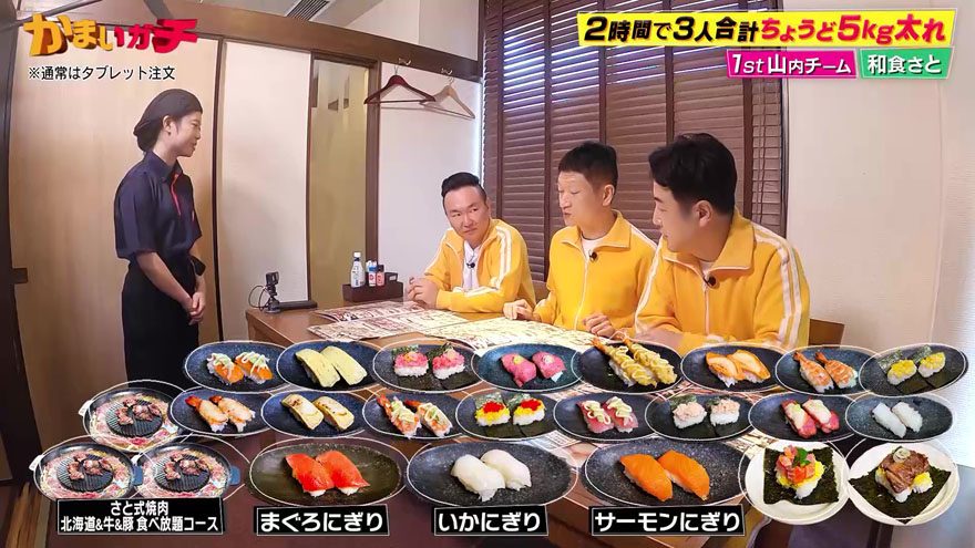 「限界まで食べて次のステージで運動して調整」という作戦を練った山内チームは、焼肉としゃぶしゃぶの食べ放題コースなど計36品を注文。ここで一気に攻めたい山内は「寿司を(全種類)1皿ずつください」と頼むが、水田は「頼みすぎてこっちに回すのはやめてな。食べれんかったら先輩の加藤さんが食べることになる」と心配する。
