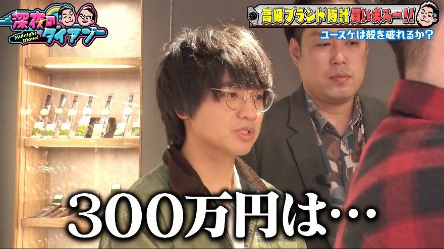 津田に「どれくらいの買ってほしい?」と聞かれた佐々木は、「300(万)はいってほしいですね」と無責任に希望を伝える。佐々木が「あんまりギラギラしてるより、おしゃれなイメージ」と続けると、ユースケも「なるほどね」と言いながら棚を吟味し始めた。