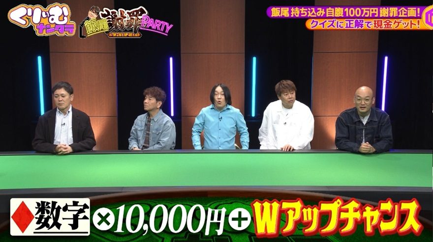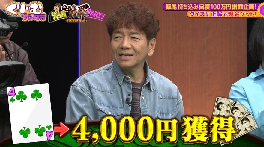 昨年放送された「ずん飯尾のスペア選手権」でスベりすぎて迷惑をかけた飯尾が、その失態を謝罪するために開催されたこの企画。飯尾に関する簡単なクイズに答え、正解すればトランプを引いて現金を獲得できるというルールだ。