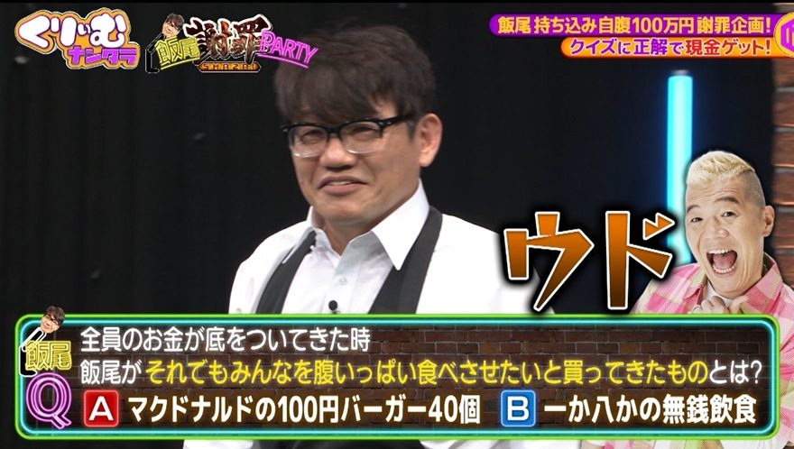 選択肢は、A「マックの100円バーガーを40個」、B「一か八かの無銭飲食うどん」。あまりのわかりやすさに、飯尾は「どっちかの答えだったら、今俺ここにいないだろ!」と“へっぽこ出題者”ウドにキレる。