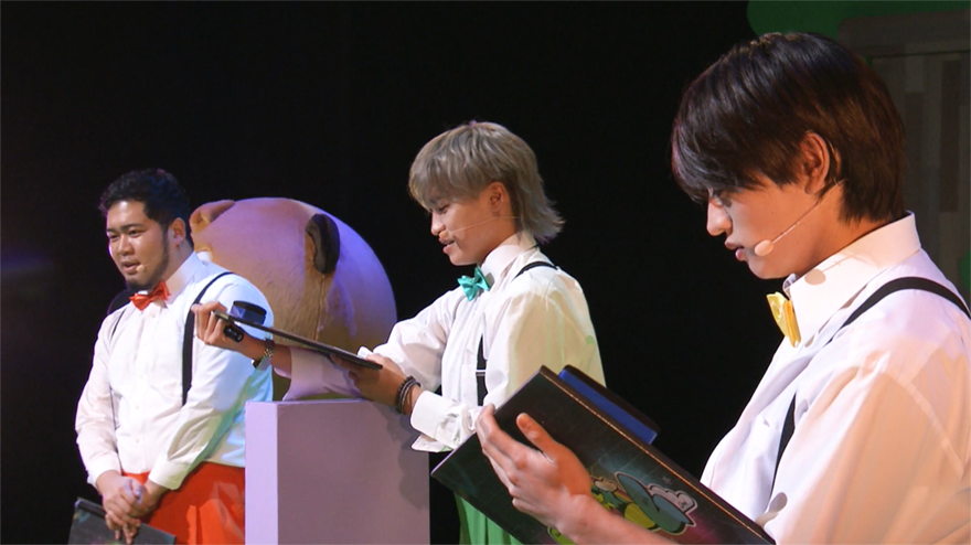 本番直前、舞台袖でスタンバイする緊張感漂う3人の様子から、初公演スタート直後の様子、そして公演中に実施したゲームまで特別公開。