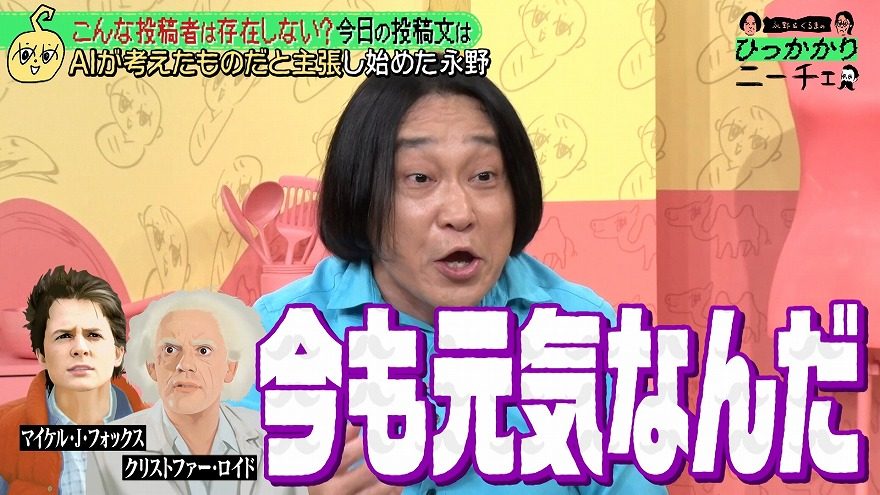 くるまが「絶対AIでしょ!」とツッコむと、永野は「バック・トゥ・ザ・フューチャーの2人が踊りだすやつとか、『マイケル・J・フォックスって今も元気なんだ』と思ったらAIで」と明かしスタジオに笑いが起こった。