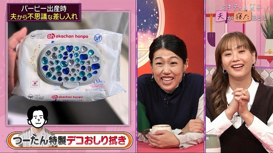 藤本が「旦那さんおもしろい」と感心すると、バービーは「ちょっと変わってるんですけど、100均でデコグッズを集めて、おしりふきのキャップをデコって持ってきてくれたんです」と続けた。