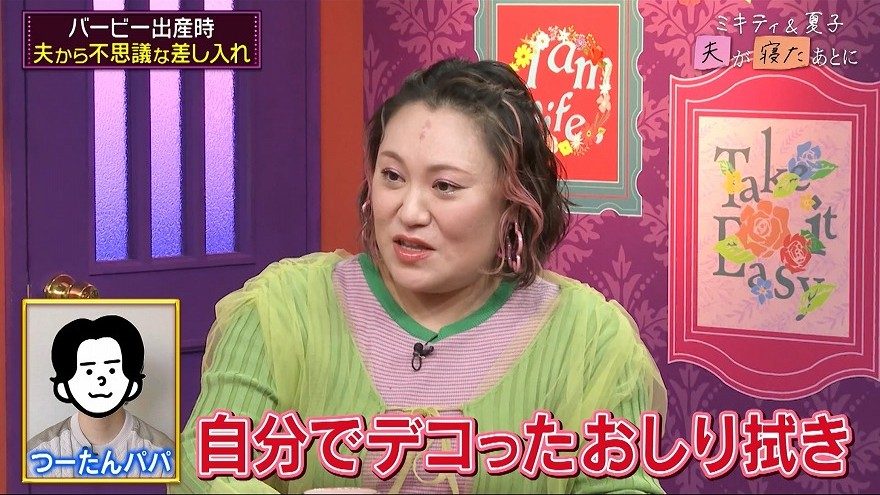 出産時について、藤本から「入院中に、旦那さんからの差し入れで嬉しかったものありますか?」と聞かれると、バービーは「『華やかな気持ちでいてほしいから』と言って、夫が自分でデコったおしり拭きを持ってきてくれた」と明かした。