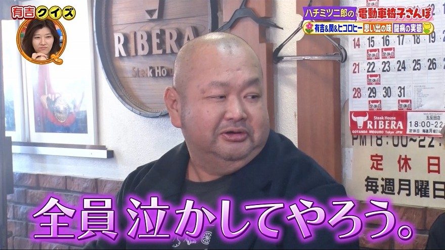 2月15日(日)の『有吉クイズ』では、有吉弘行と東京ダイナマイト・ハチミツ二郎が電動車椅子で街ブラする企画の第2弾「ハチミツ二郎が行く!! 電動車椅子さんぽin五反田」の後編が放送された。